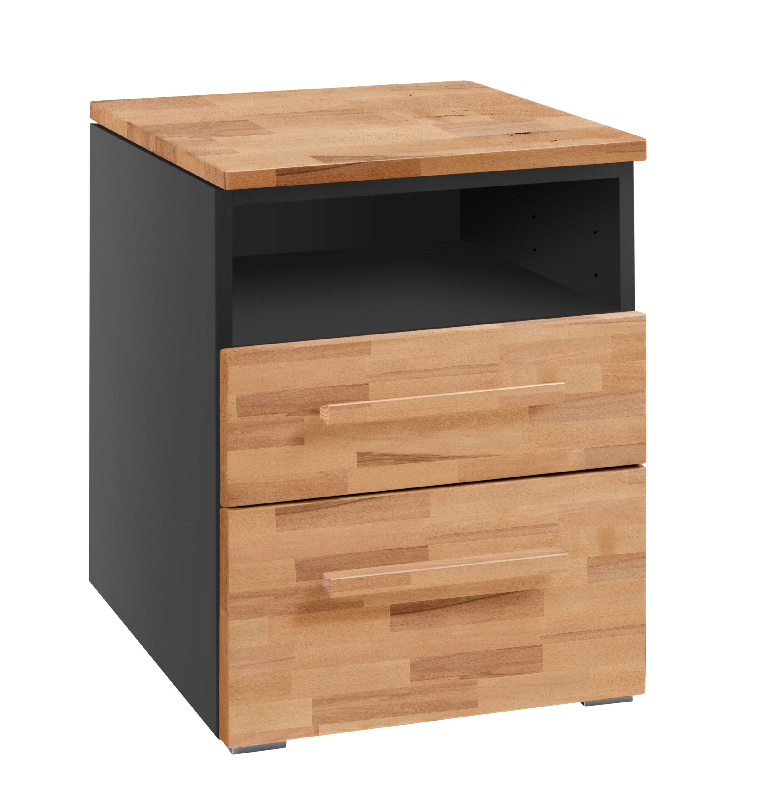 Beim Nachttisch „Dowe“ können Sie zwischen einem hellen Weiß oder einem dunklen Anthrazit für den Korpus wählen. Die Front des Nachttischs steht Ihnen in einer Vielzahl von acht Farben zur Verfügung, sodass Sie die Möglichkeit haben, den Nachttisch an Ihren persönlichen Geschmack und Stil anzupassen. Sollten Sie sich für eine weiße oder anthrazitfarbene Front entscheiden, werden standardmäßig Alugriffe mitgeliefert, während bei einer Holzfront Holzgriffe enthalten sind. Optional können Sie jedoch auch Metallgriffe für eine Holzfront bestellen, um Ihrem Nachttisch einen noch moderneren Touch zu verleihen.