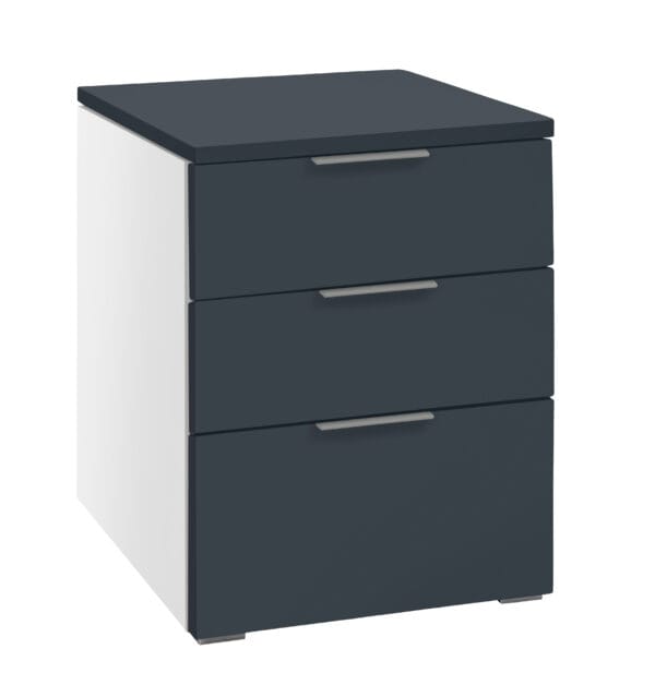 Wählen Sie zwischen einem klassischen weißen oder einem ansprechenden anthrazitfarbenen Korpus, um den „Trio“ Nachttisch perfekt an Ihren persönlichen Stil anzupassen. Die Front des Nachttisches steht in acht verschiedenen attraktiven Farboptionen zur Auswahl, sodass Sie die Möglichkeit haben, eine individuelle Akzentfarbe zu wählen. Sollten Sie sich für eine weiße oder anthrazitfarbene Front entscheiden, werden standardmäßig Alugriffe mitgeliefert, während bei einer Holzfront Holzgriffe enthalten sind. Optional können Sie jedoch auch Metallgriffe für eine Holzfront bestellen, um Ihrem Nachttisch einen noch moderneren Touch zu verleihen.